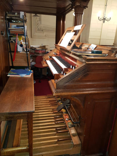 C1L’orgue du Temple Saint-Esprit inauguré à noël 1865 est l’œuvre de Merklin-Schütze et compte 10 jeux sur deux claviers dont un Récit commençant au deuxième ut et un pédalier court en tirasse. A l’origine, la tribune avait le même largeur que le buffet avec la console détachée au bord de la balustrade.En 1899, la tribune fut étendue par l’ajout des ailes obliques afin de procurer plus de place pour des chanteurs, tandis que l’instrument fut reconstruit par Charles Mutin. Il disposait désormais de 14 jeux dont deux emprunts à la pédale (avec une étendue, à l’époque rarissime, de 32 notes – claviers manuels de 56 notes chacun).Ayant constaté que malgré l’extension de la tribune tout travail raisonnable d’une chorale était impossible (exiguïté, buffet qui empêchait de voir le chef…), en 1909 on demanda à Mutin de reculer les éléments du rez-de-chaussée de la tribune, vidant tout le soubassement à l’exception de la console qui désormais se trouve exceptionnellement sous l’orgue ; le grand soufflet réservoir est posé derrière l’instrument. Un seul relevage a jalonné son histoire, vers 1970, par Danion/Gonzalez au cours duquel toute modification a été interdite.2024-2025: restauration par Quentin Requier.Les travaux, réalisés entre janvier 2024 et avril 2025 ont consisté notamment à rétablir un fonctionnement optimal de l’ensemble de la partie instrumentale en privilégiant autant que possible un retour à l’état historique de référence. On a:•nettoyé et restauré le buffet •restauré l'appel de la Trompette•restauré les sommiers du Grand-orgue et du Récit •renouvelé les peaux et les papiers des réservoirs•amélioré la fourniture du vent par le renouvellement de la turbine.
