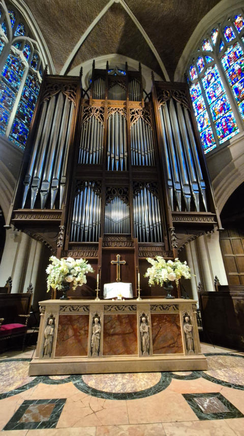 D1L’ancien orgue AbbeyJusqu’en 1988, l’église possédait un instrument à traction électrique, construit par Abbey en 1931de 47 jeux répartis sur 3 claviers de 61 notes et un pédalier de 32 notes. Cet orgue était disposé en plusieurs endroits de l'église. Le GO et le Récit étaient placés dans un buffet plat situé sur une tribune latérale à proximité du chœur. Le Positif et la Pédale étaient disposés au sol, derrière l'arcade gauche du chœur. Enfin, la division d’Écho (jouable sur le 3ème clavier) se situait en antiphonal sur une petite tribune en fond de nef. Enfin, la console indépendante était placée dans le chœur, à droite. Malheureusement, la compagnie fit faillite avant que les travaux soient terminés. La fin de la construction et du montage se fit à la hâte mais l'orgue souffrit de défauts de conception. Les tuyaux étaient placés dans une pièce annexe s'ouvrant en baie sur le sanctuaire. Cet emplacement, qui avait été jugé convenable par le facteur, s'avéra néfaste à la sonorité de l'instrument, le son ayant des difficultés à se projeter dans l'église malgré la pression du vent qui altère par ailleurs la beauté et la clarté des timbres.De plus, la console était située dans le côté opposé de l'église. La transmission électropneumatique d'Abbey s'avéra extrêmement fragile, ajoutant au retard d'émission du son et causant de nombreuses pannes et réparations coûteuses.La console fut remplacée par Casavant et un relevage fut effectué en 1968, par Jean Jonet. En 1987, la tuyauterie a été vendue pour financer le Beckerath. Les claviers sont à Notre-Dame du Perpétuel Secours.Le buffet de l'ancien orgue Abbey est toujours en place sur la tribune latérale, au dessus du chœur.L’orgue BeckerathEn 1988, l’instrument fut remplacé par un orgue neuf de style germanique par la Maison Von Beckerath de Hamburg. Suite aux leçons apprises de l'expérience précédente, il fut décidé que le nouvel instrument serait placé dans le sanctuaire contre le mur du fond du choeur. La conception de l'instrument, selon le « Werkprinzip », est due à Gerhard Scharenberg. Chaque plan sonore possède son propre buffet, le tout enchâssé dans un meuble de style gothique. Le récit (3è clavier) surplombe les claviers, les tuyaux sont en boîte expressive, à l'exception du jeu de Violprincipal 8', en façade masquant les jalousies. Au centre du buffet, le Grand Orgue (2è clavier) avec les petits tuyaux du Principal 8' en montre. Au sommet du buffet, le Positif (1er clavier), avec le Principal 4' en montre. La Pédale est divisée en deux buffets encadrant l'ensemble, le Principal 16' en montre.La construction, en atelier, commença en juillet 1987 et dura neuf mois. L'instrument, opus 208 de la maison Beckerath, arriva à Paris le 7 avril 1988 pour être monté sous la responsabilité de Klaus Schmekal. Six sommiers, largement dimensionnés, construits en pin de l'Orégon, accueillent les 3328 tuyaux de fabrication artisanale dont 116 sont en bois (basses de Gedackt 16', du Bordun 16', de la Rohrflöte 8'; jeux de Violprincipal 8' et Gedackt 8') Les tuyaux de métal sont en alliage étain-plomb à 78% de Zn pour les Montres, 56% pour les Principaux, 46% pour les résonateurs d'anche et 36% pour les Flûtes. La préharmonisation de Hans Ulrich Erbslöh a été parachevée par Rolf Miehl et Timm Sckopp. Les motifs d'ébénisterie sont de Gunther Hamann.Source